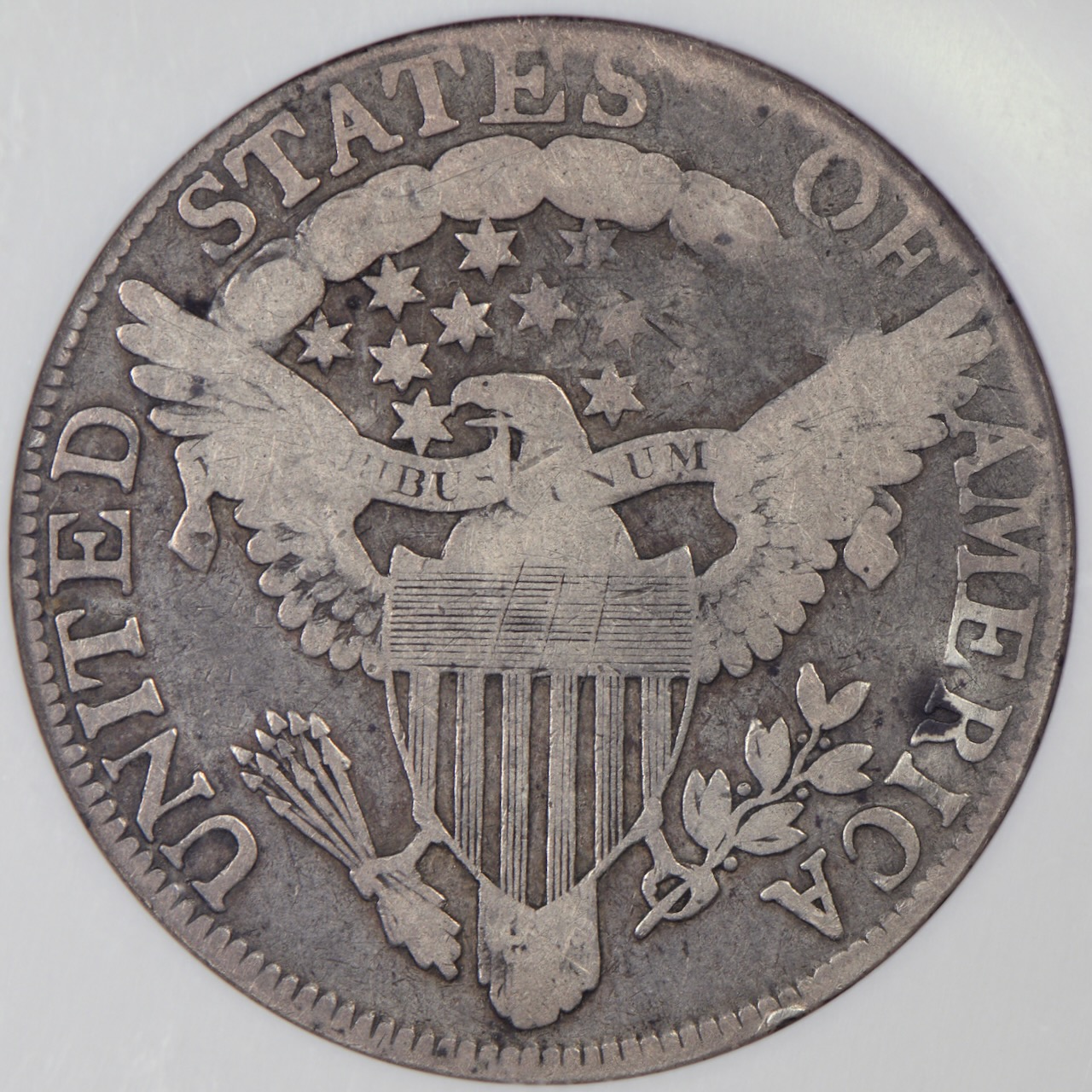 One of the most spectacular obverse die breaks on a Bust half dollar occurs on the 1805 O-103 die marriage! A heavy die break from the edge between the Y and star 8 extends to the nose, across the bust and curls, and eventually splits to form a large, triangular break on the die covering star 1 and most of star 2. Most students of the series believe that this triangular section does not break completely out of the die per Overton, but well worn specimens may show little or no detail in that area.